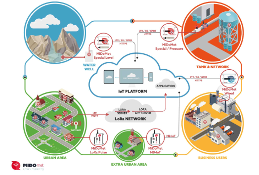 MiDoMet the world leader in smart metering system based on electronic devices (LoRaWan, NBIoT, LTE ga-teway/datalogger) and services in cloud computing for energy management, for monitoring water in urban or extra urban areas. , MiDo products allow you to:- keep the physical and administrative losses that represent costs and lost profits;- respond to the growing need to equip itself with remote management systems for the supply and monitoring of consumption