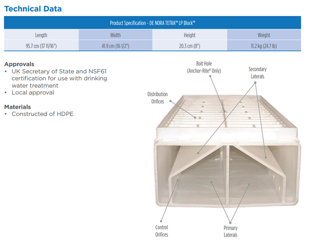 The DE NORA TETRA™ LP Block™ underdrain ensures lower operating costs and effective backwash distribution that can improve run times.