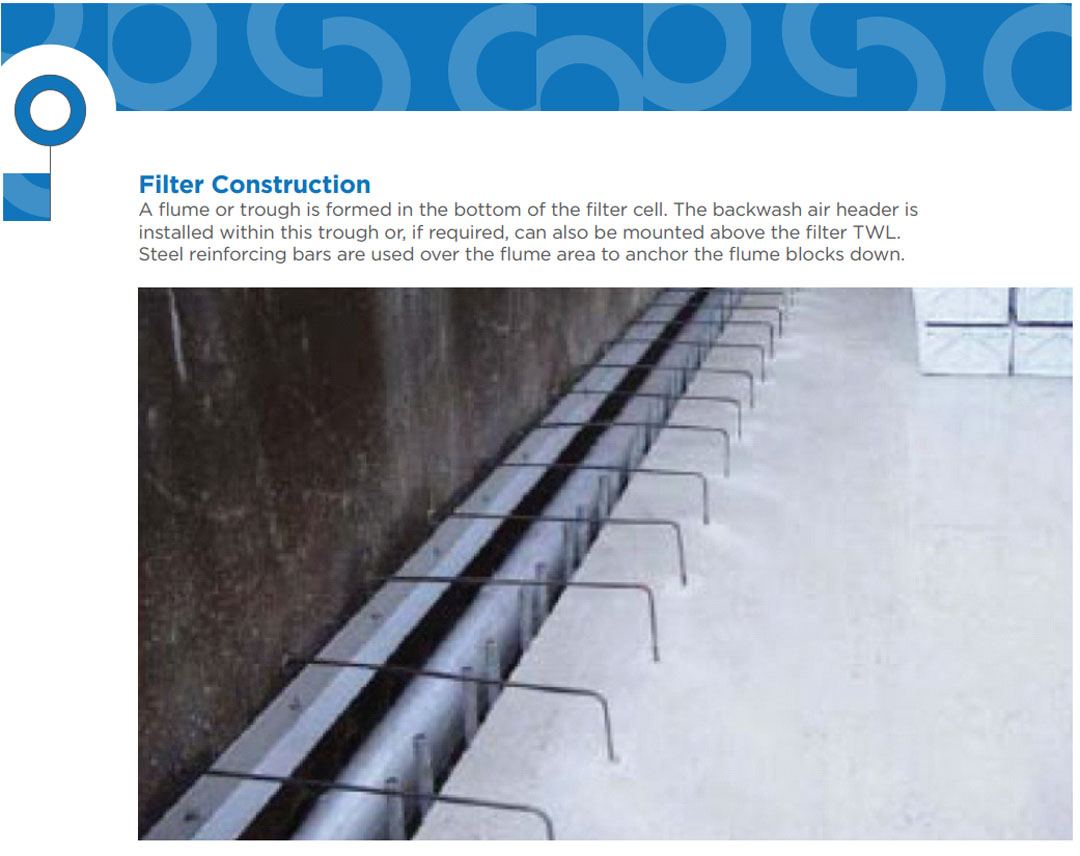 A flume or trough is formed in the bottom of the filter cell. The backwash air header is installed within this trough or, if required, can also be mounted above the filter TWL. Steel reinforcing bars are used over the flume area to anchor the flume blocks down.
