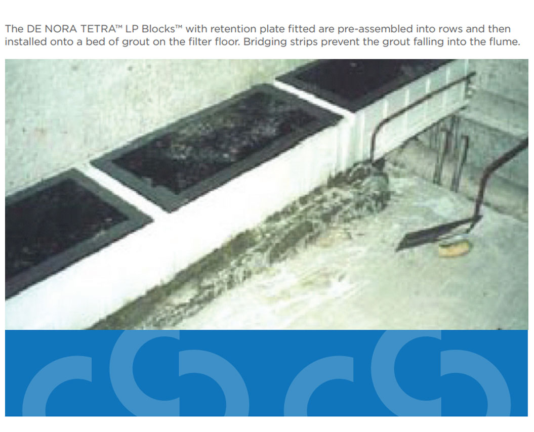 The DE NORA TETRA™ LP Blocks™ with retention plate fitted are pre-assembled into rows and then installed onto a bed of grout on the filter floor. Bridging strips prevent the grout falling into the flume.