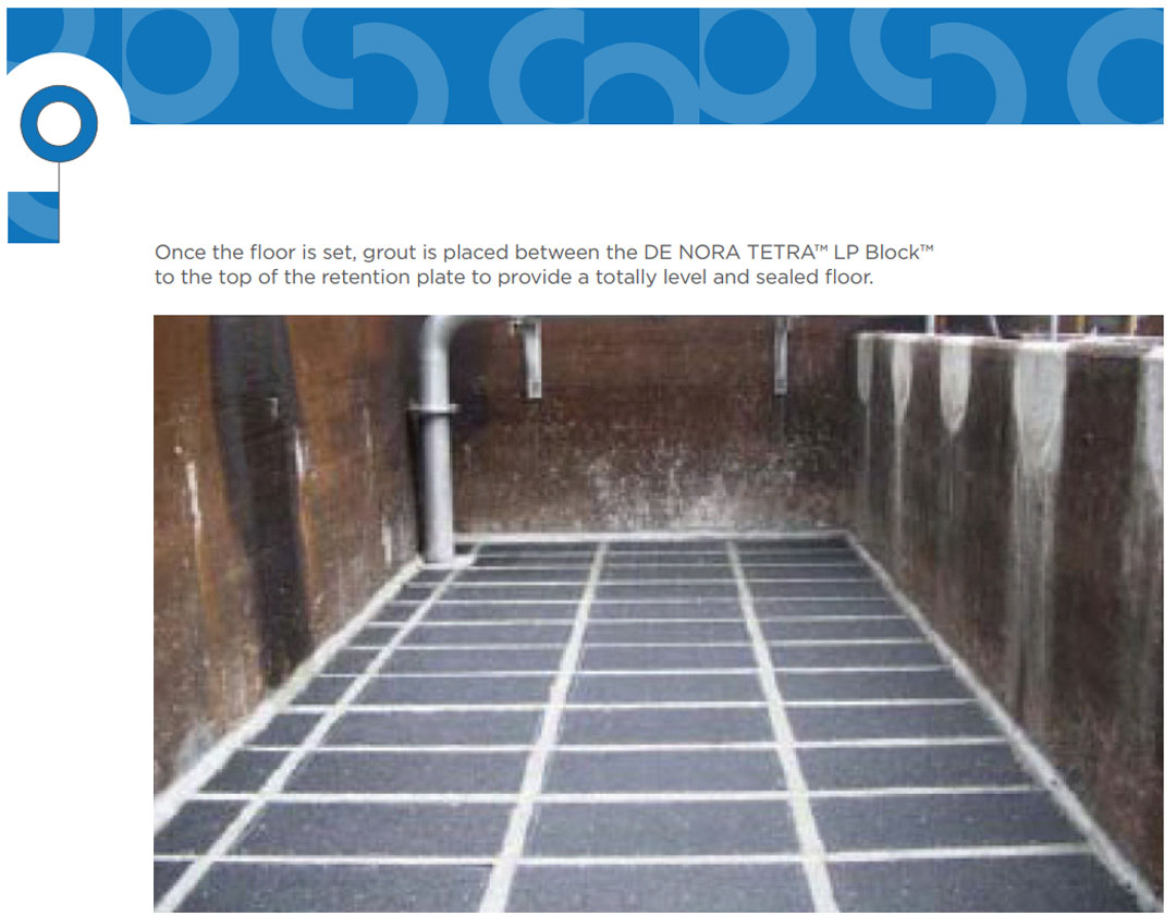 Once the floor is set, grout is placed between the DE NORA TETRA™ LP Block™ to the top of the retention plate to provide a totally level and sealed floor