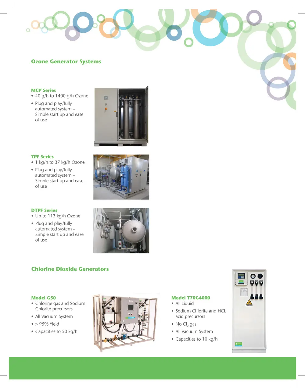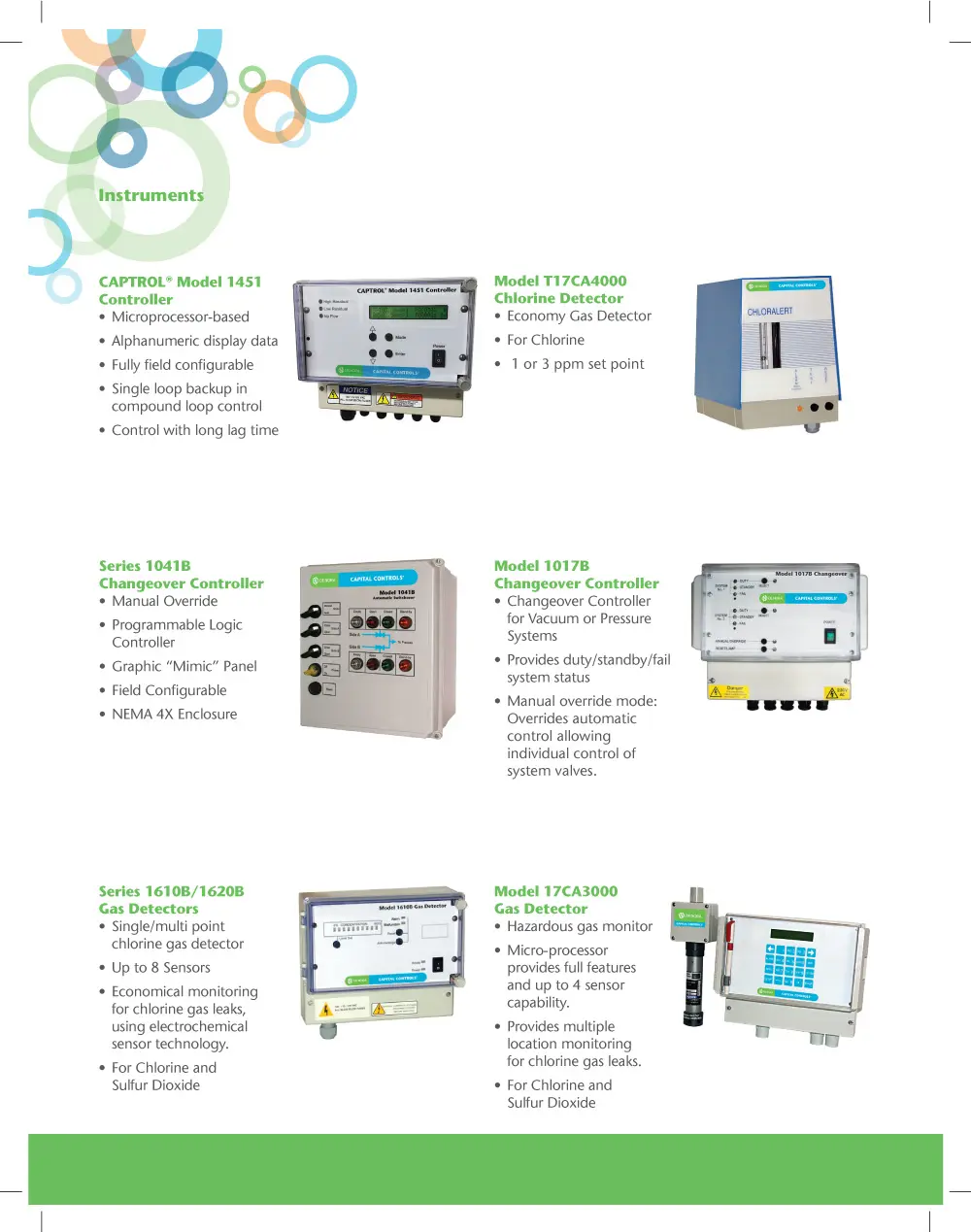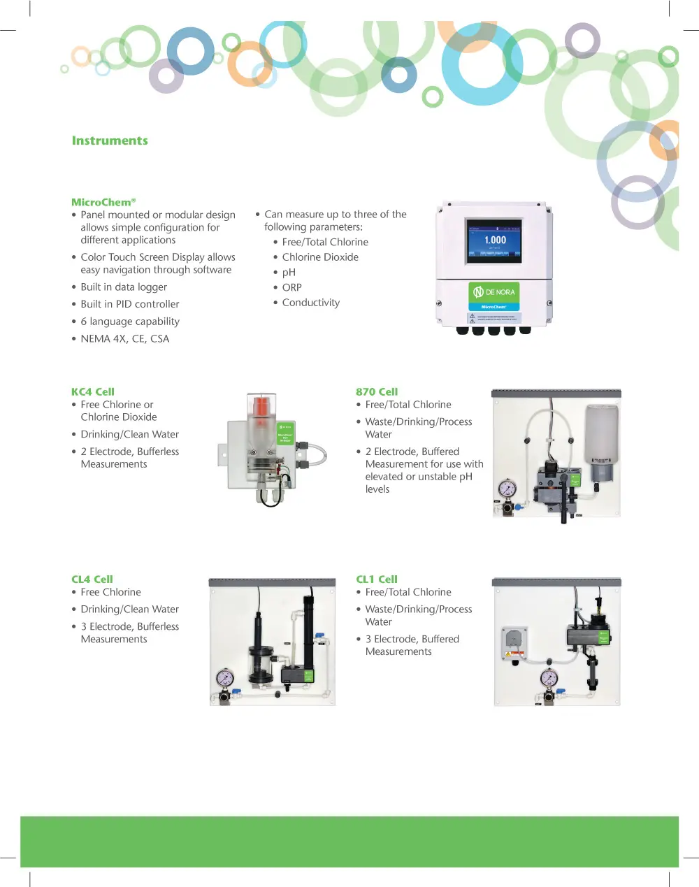 • Panel mounted or modular design allows simple configuration for different applications • Color Touch Screen Display allows easy navigation through software • Built in data logger • Built in PID controller • 6 language capability • NEMA 4X, CE, CSA Instruments • Can measure up to three of the following parameters: • Free/Total Chlorine • Chlorine Dioxide • pH • ORP • Conductivity